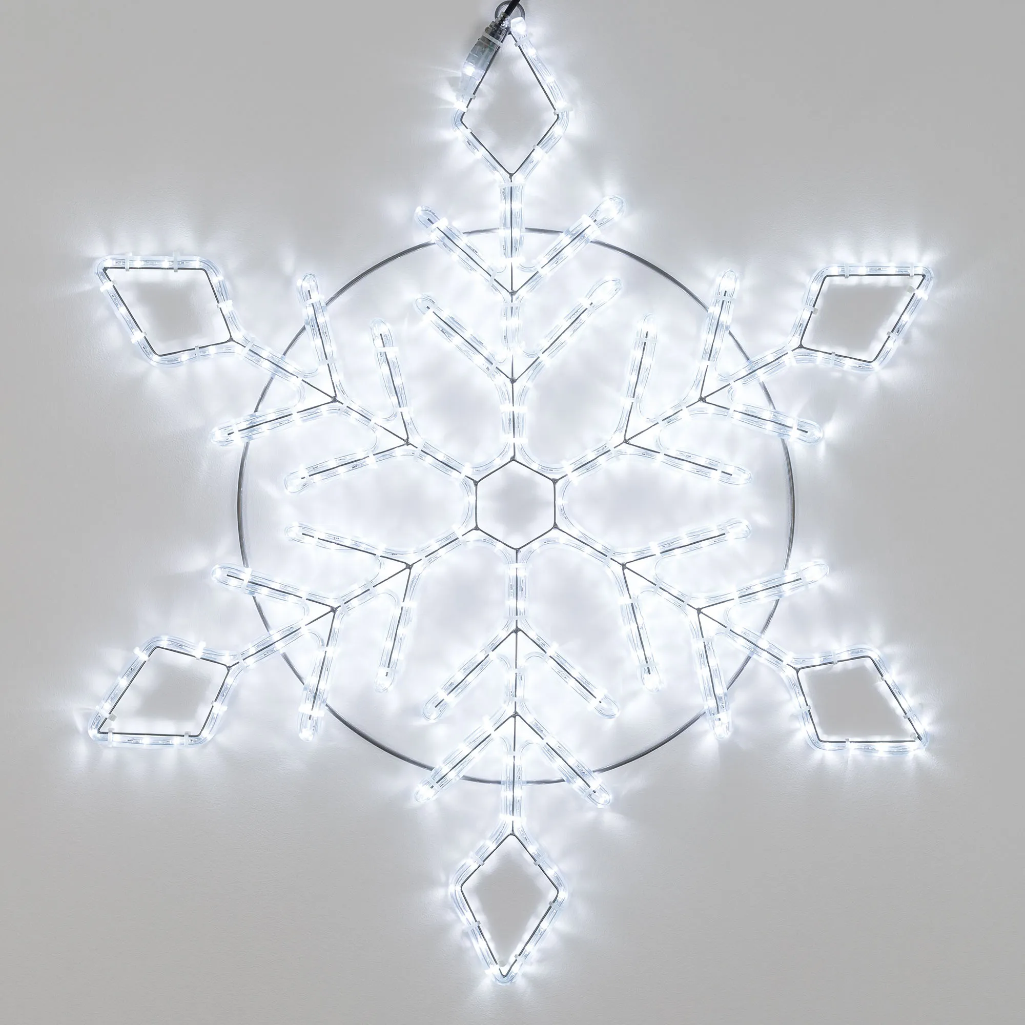 Светодиодная фигура СНЕЖИНКА. Размер 900x900 мм. Цвет светодиодов БЕЛЫЙ (6000 К), постоянное свечение. 360 светодиодов. Напряжение питания 230 В, потребляемая мощность 22 Вт, степень пылевлагозащиты IP65. Фигура укомплектована проводом питания для подключения к сети 230 В (без вилки питания).