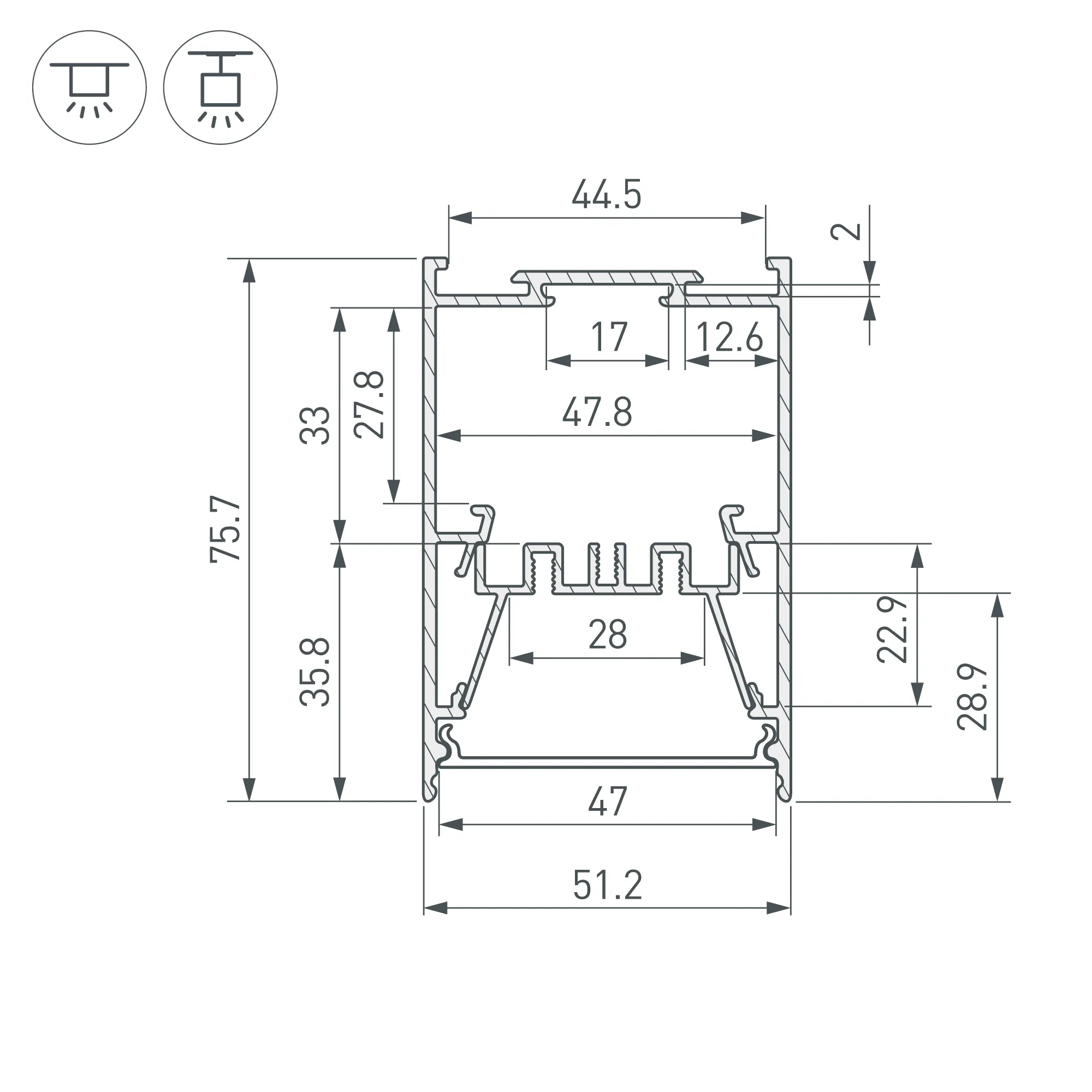 Алюминиевый накладной профиль для светодиодных лент и линеек. Цвет - черный RAL9005 (порошковая окраска). Габаритные размеры (L×W×H): 2000x51,2x75,7 мм. Ширина площадки для ленты 28 мм. Отсек для БП 47,8х27,8 мм. Экраны, заглушки и другие аксессуары приобретаются отдельно. Цена за 1 метр.