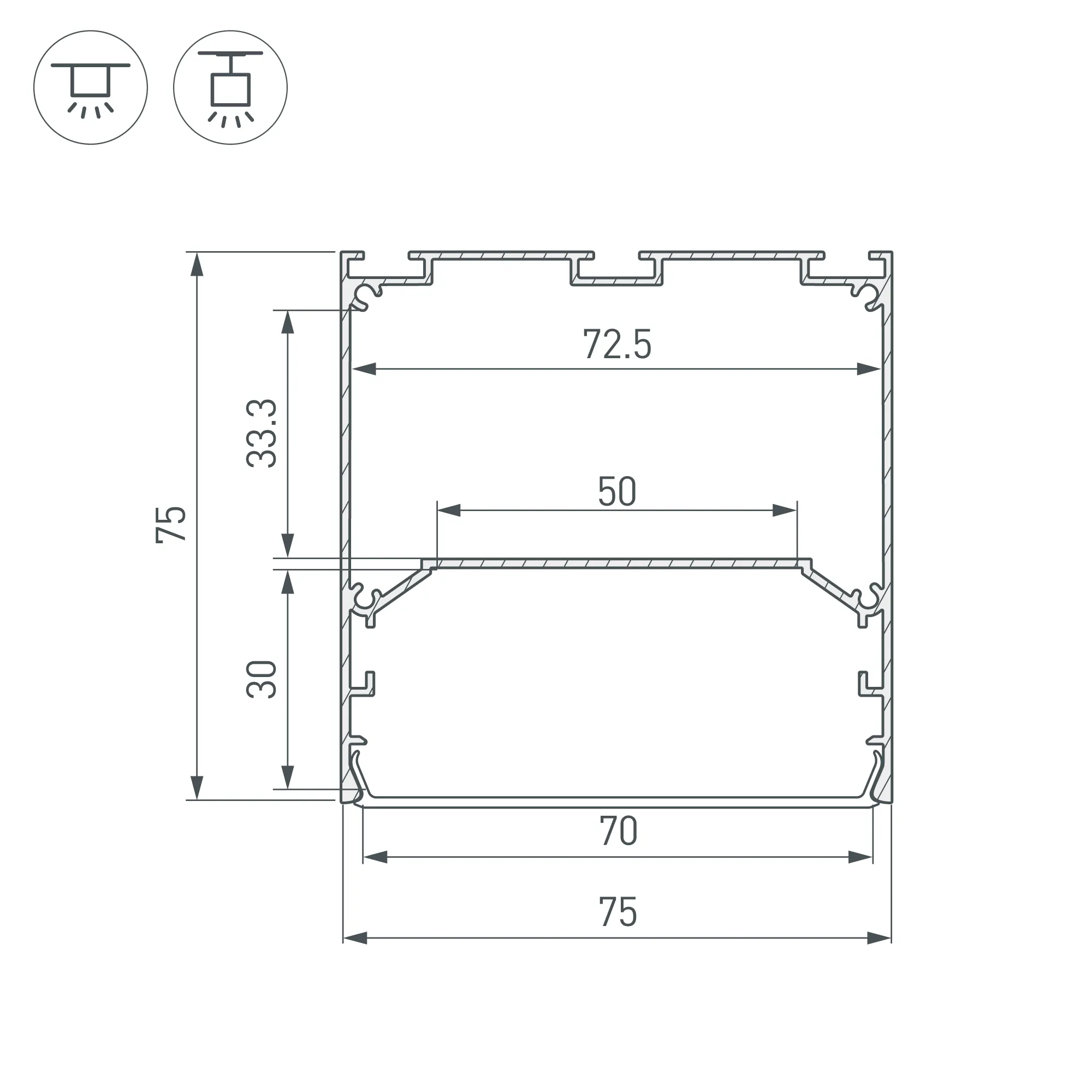 Алюминиевый анодированный профиль для светодиодных лент и линеек. Габаритные размеры (L×W×H): 2000x75x75 мм. Ширина площадки для ленты 50 мм. Отсек для БП 72,5х33,3 мм. Экраны, заглушки и другие аксессуары приобретаются отдельно. Цена за 1 метр.