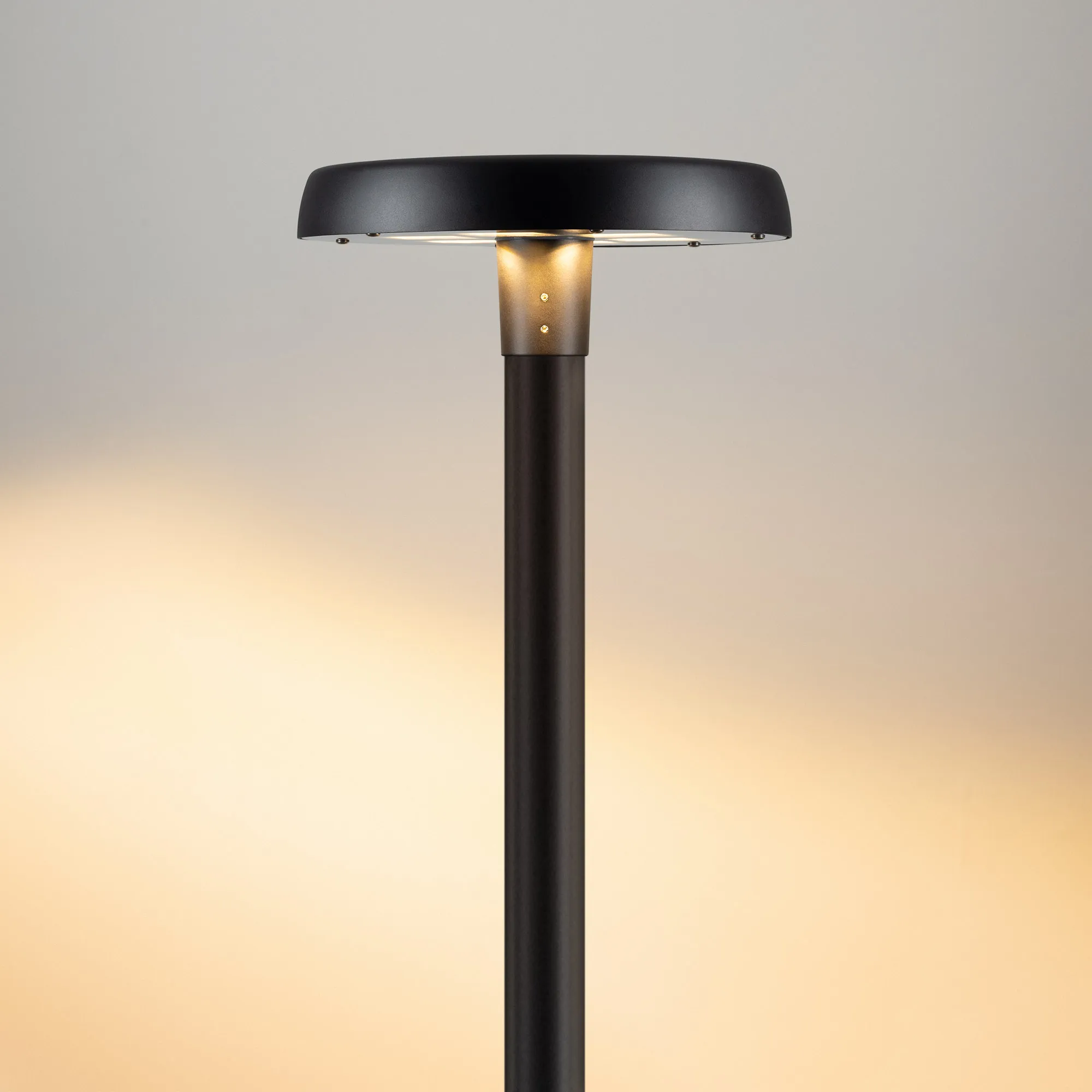 Поставка под заказ от 5 шт. Венчающий светодиодный светильник. Мощность 50 Вт, св. поток 5680 лм, 112 лм/Вт, дневной 4000 K, CRI>80, угол 140°, напряжение питания 230 В. Черный корпус из алюминия, экран закаленное стекло, степень защиты IP65. Размер: диаметр 510 мм, высота 200 мм. Монтаж на вертикальную опору диаметром 76 мм.